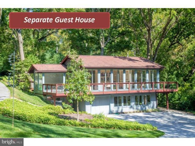 New Professional photos to come- Modern elegance and expansive living spaces define this exceptional six-bedroom estate by renowned builder Robert McElroy, privately set on 3.83 acres and featuring a SEPARATE GUEST HOUSE. Beyond the gated entrance, a long, winding drive leads to a sophisticated yet understated residence highlighted by soaring ceilings, walls of glass, and rich wood accents throughout. A dramatic glass atrium-style reception hall with slate flooring creates a striking first impression. The stunning living room boasts a vaulted ceiling and an impressive window wall, filling the space with natural light and offering serene views of the surrounding landscape. The adjacent dining room, also with a vaulted ceiling and glass walls, provides seamless access to a wraparound deck—perfect for indoor-outdoor entertaining. The gourmet, center-island kitchen is a true showpiece, featuring exotic wood and stainless steel cabinetry, Blue Macaubas granite countertops, honed limestone floors, with premium appliances. Glass doors lead directly to the deck and pool area. A bright breakfast room with floor-to-ceiling windows connects the kitchen and family room, complete with custom built-ins. The main level is further enhanced by a luxurious primary suite offering a private sitting room, walk-in closet, and a sleek, spa-like bath. The lower level includes five additional bedrooms, 2 bathrooms, a laundry room, and a spacious recreation room with multiple windows and sliding glass doors, providing direct outdoor access. In harmony with the main residence, the guest house (built in 1990) offers approximately 1,000 square feet on the upper level, which could be used as a spacious home office with a sink, dishwasher, refrigerator, powder room, and access to a private deck through sliding glass doors. The lower level features an exercise room, full bath with shower, and a one-car garage. Additional highlights include a two-car attached garage, a whole-property generator servicing the home, guest house, and front gate, and beautifully landscaped grounds with mature trees. The resort-style swimming pool creates a private outdoor oasis, ideal for both relaxation and entertaining. A rare offering combining architectural distinction, privacy, and luxury amenities.